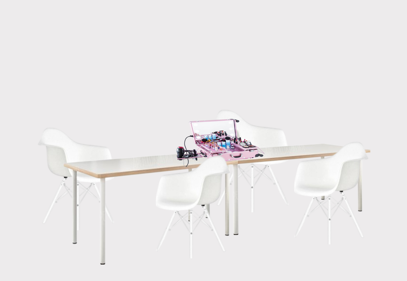 1 стол, 2 стула, тик-ток лампа, зеркало. Визажист со своими расходными материалами